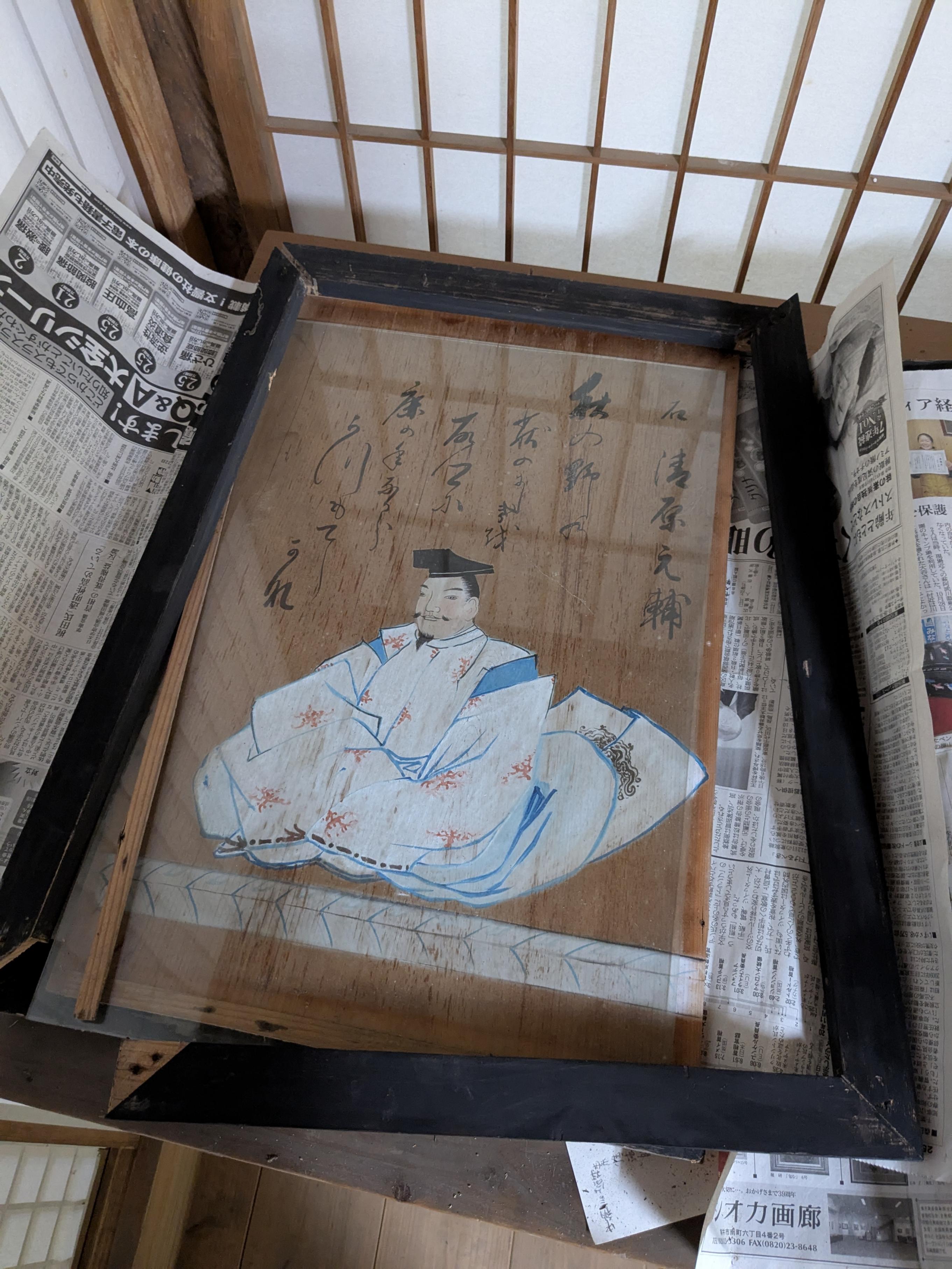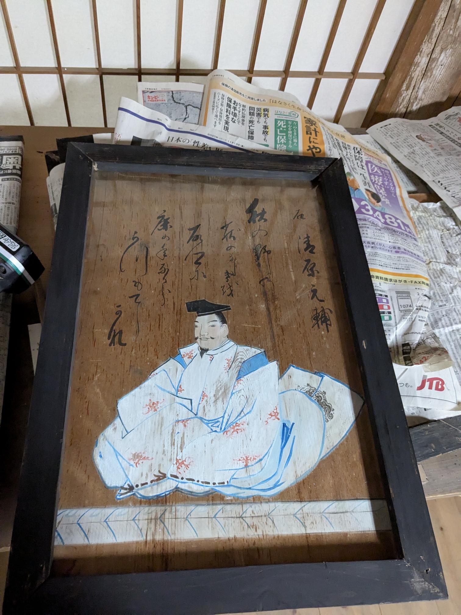 拝殿の上に飾られている歌人と和歌の額が、時の経過とともに額縁が緩むなどして危険な状態となっているものが見受けられました。いくつか取り外して修理しています。絵がきれいになることはありませんが落ちてくることがないようにしたいと思います。