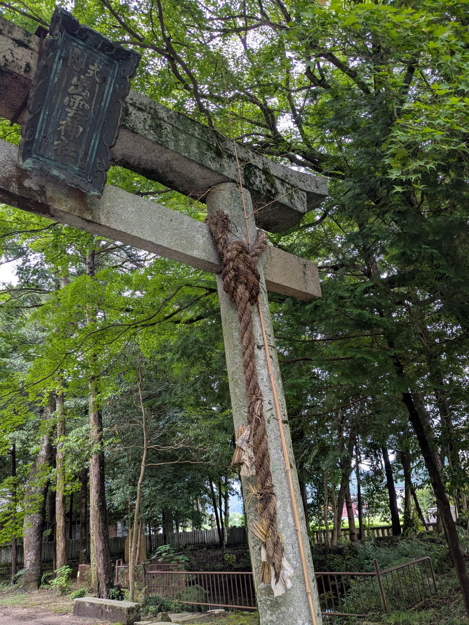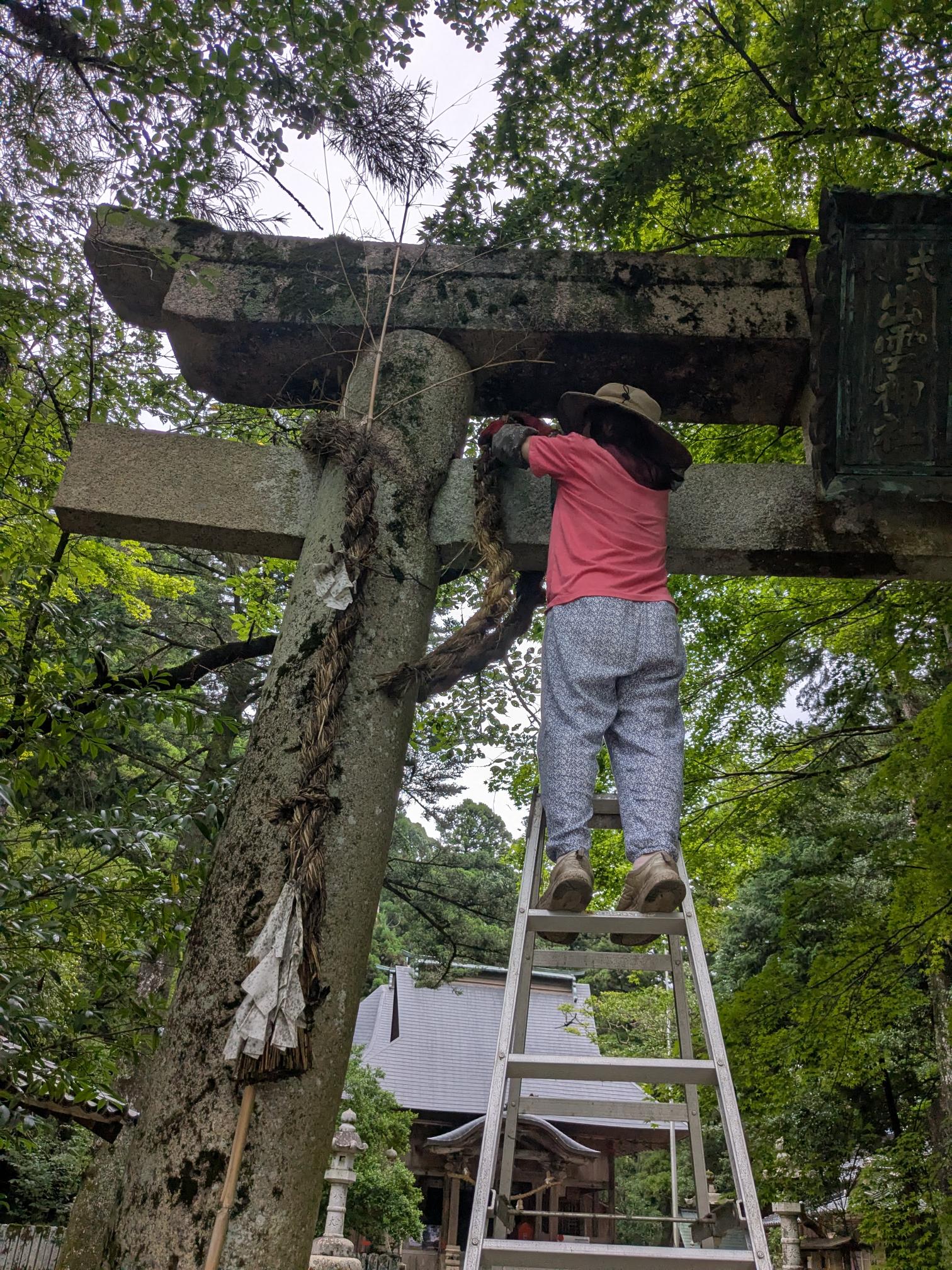 二の鳥居に、昨年の秋祭りにかけたしめ縄が、連日の大雨により切れてしまいました。補修できないかとも思いましたが、ちょっと無理なようなので取り外すことにしました。