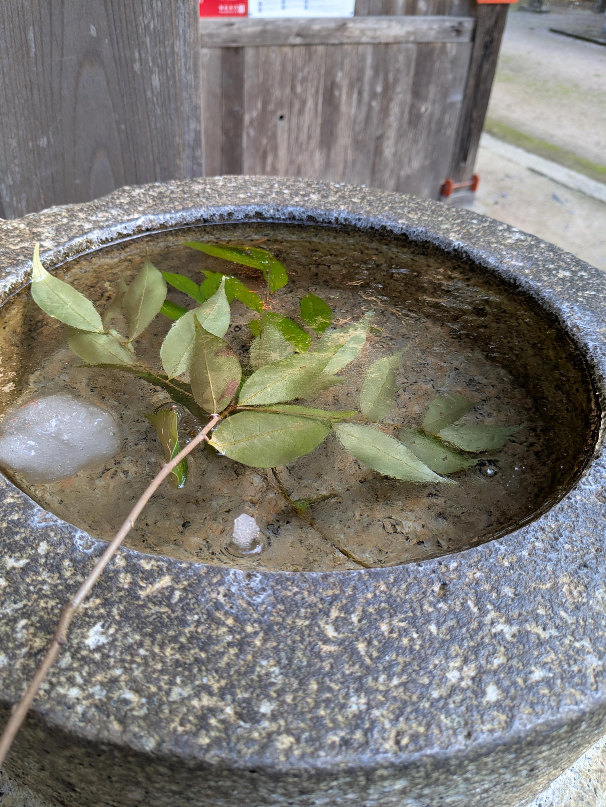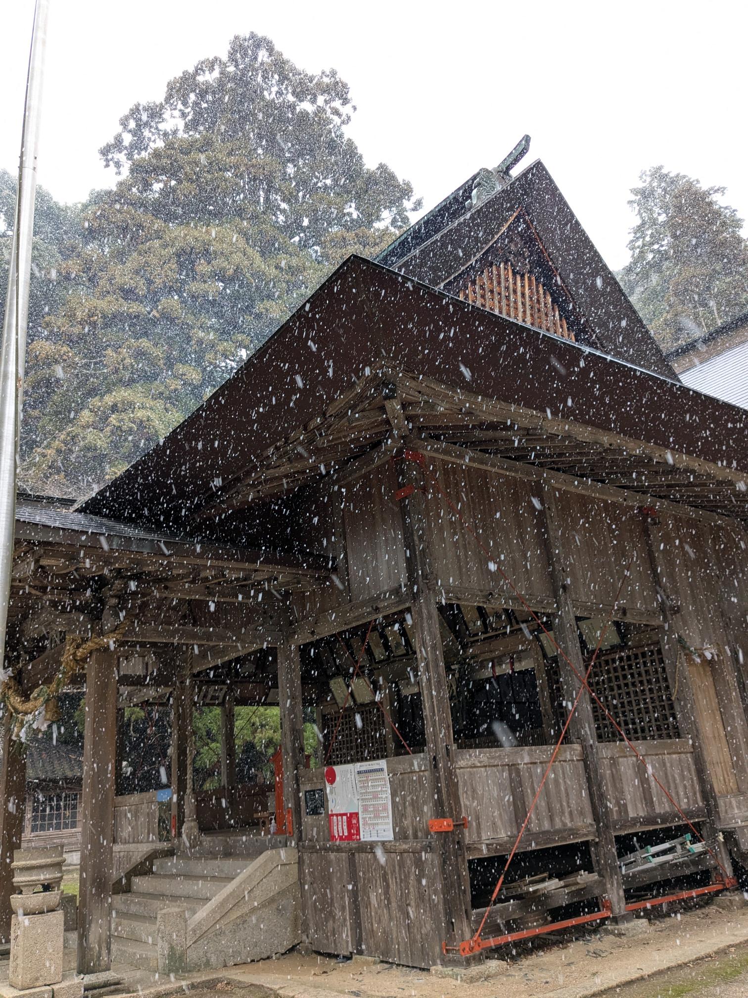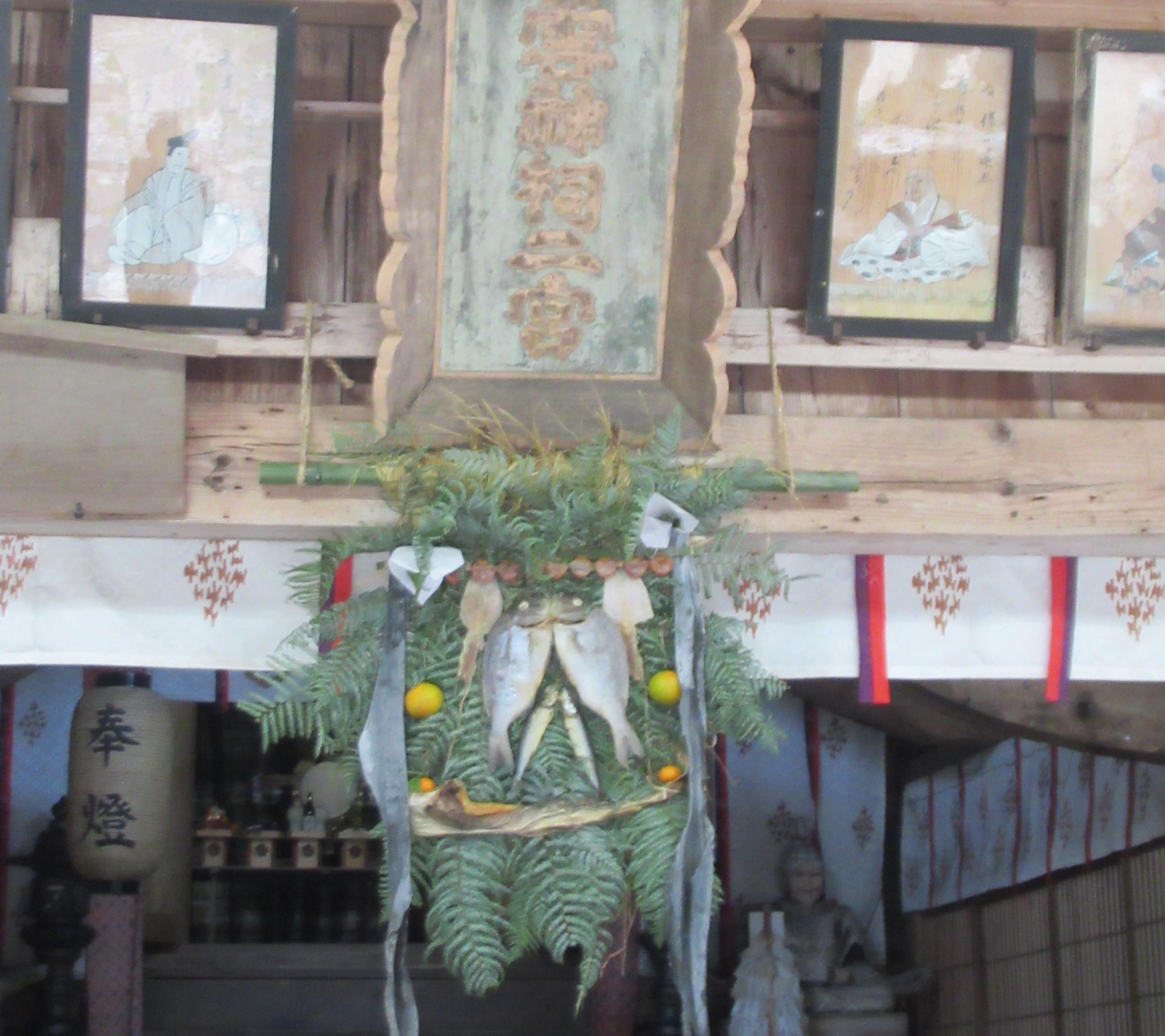 令和8年、明けましておめでとうございます。今年もよろしくお願いします。 今回は、当神社に代々伝わるお正月の板飾り(いたかざり)をご紹介します。 これは、毎年神職及びその関係者が年末に作成しており、拝殿の奥の上方に掲げられ、ご参拝の方々に興味深くご覧いただき、他では見られないものとして、いわれやその起源などについて多くのご質問をいただくなどしています。 この板飾りは、当神社に毎年飾っているもので、中央に鯛を配し、その上下にイワシやゆずり葉、干し柿、するめ、昆布、ダイダイ、葉付きミカン、棒鱈などを飾っています。これらにはそれぞれ意味するところがあるのですが、おわかりでしょうか。 鯛は「めでたい」と、どなたでも連想できると思いますが、そのほかのものはいかがでしょうか。答え(?)は来年のブログまたは境内への掲出にてお知らせいたしたいと思います。 また、2日の午後からは雪が降り始め、多くは積もらなかったものの清め桶の水も凍るような寒い中、多くの方々にご参拝いただき、ありがとうございました。